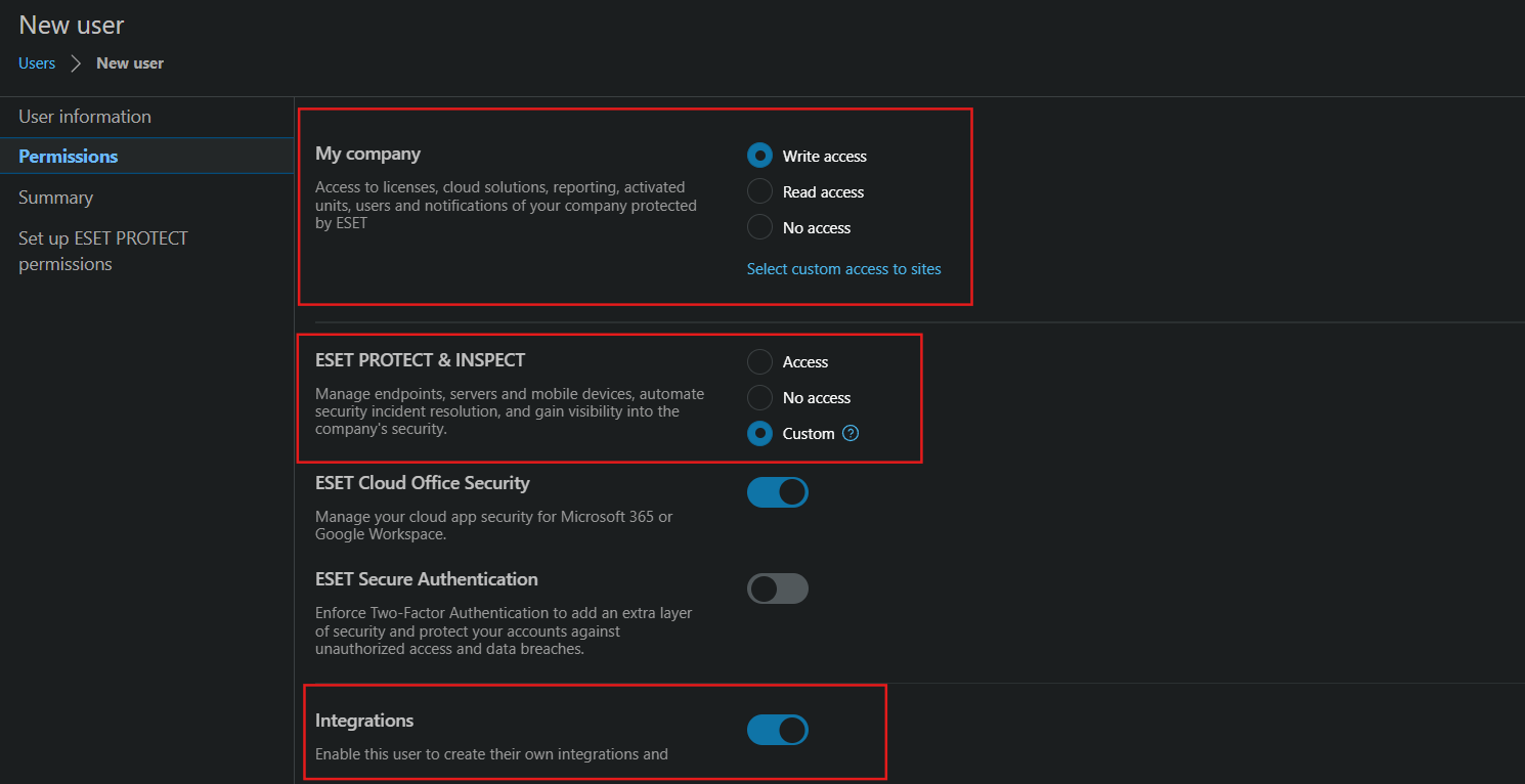Under Permissions, select Write Access in My Company and Custom for ESET Protect then ele the Integrations toggle to allow API usage.